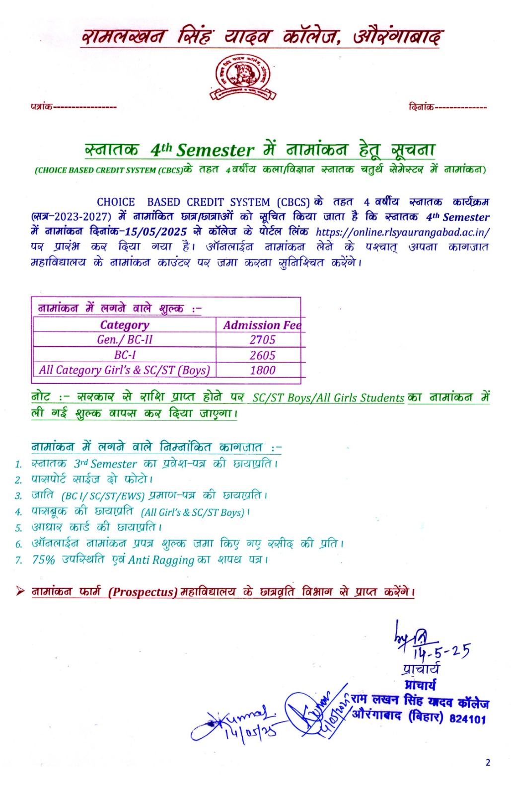 NOTICE REGARDING UG 4TH SEMESTER ADMISSION(2023-27)